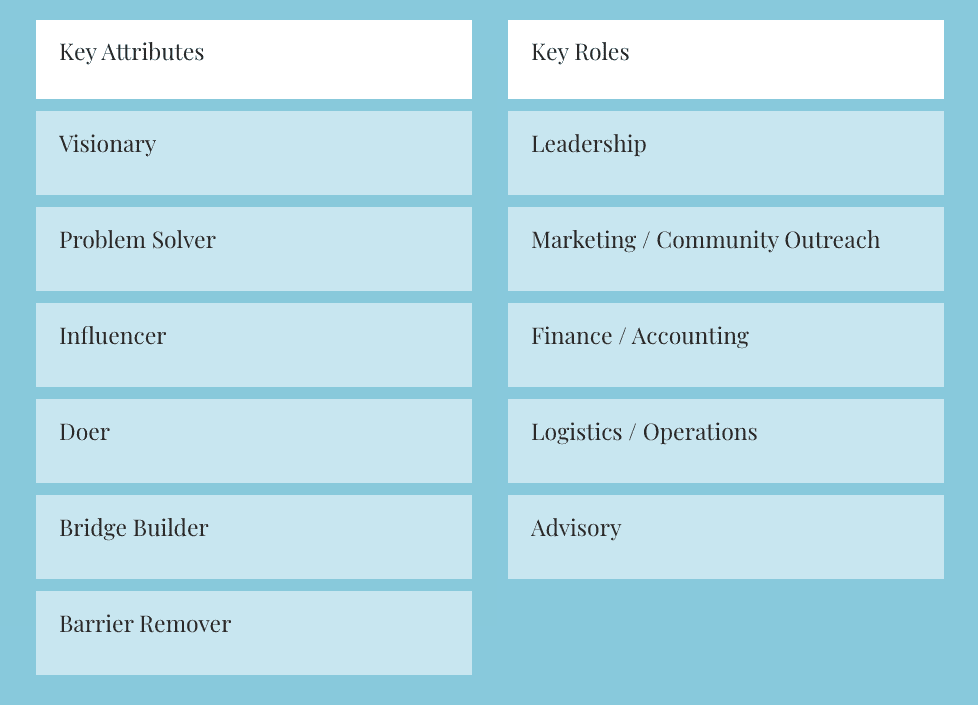 Other factors to consider as you build your team are the members’ personal strengths, work experience, networks, and leadership styles. There will be plenty of work to do, so a team with only leaders and without implementers could stall. Think about how to ensure that all the following attributes and roles are covered as you recruit members to your team.